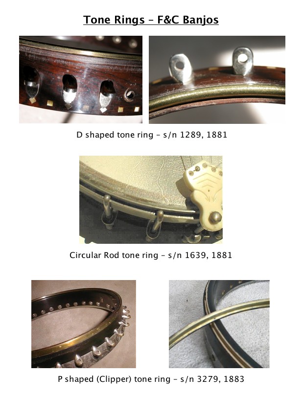|  | The inlays are fairly crude saw-cut mother of pearl arranged in interesting patterns. Some of these F&C banjos have considerable amounts of such inlays covering much of the peghead, fingerboard and pot. Some F&C banjos also had rudimentary carving on the heel. The later higher grade Fairbanks banjos had quite varied and beautiful heel carving. |